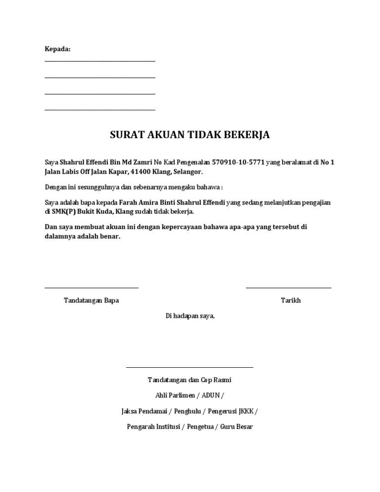 . Satu kerja pula kena google format surat akuan tidak bekerja taip print dan pergi cari orang untuk sahkan surat akuan tu -_____-Mujur jumpa blog Pesuruhjaya Sumpah Nur yang. SURAT AKUAN TIDAK BEKERJA Saya Shahrul Effendi Bin Md Zamri No Kad Pengenalan 570910-10-5771 yang beralamat di No 1 Jalan Labis Off Jalan Kapar 41400 Klang Selangor. Download PDF - Surat Akuan Tidak Bekerja 19n0qez0p34v.